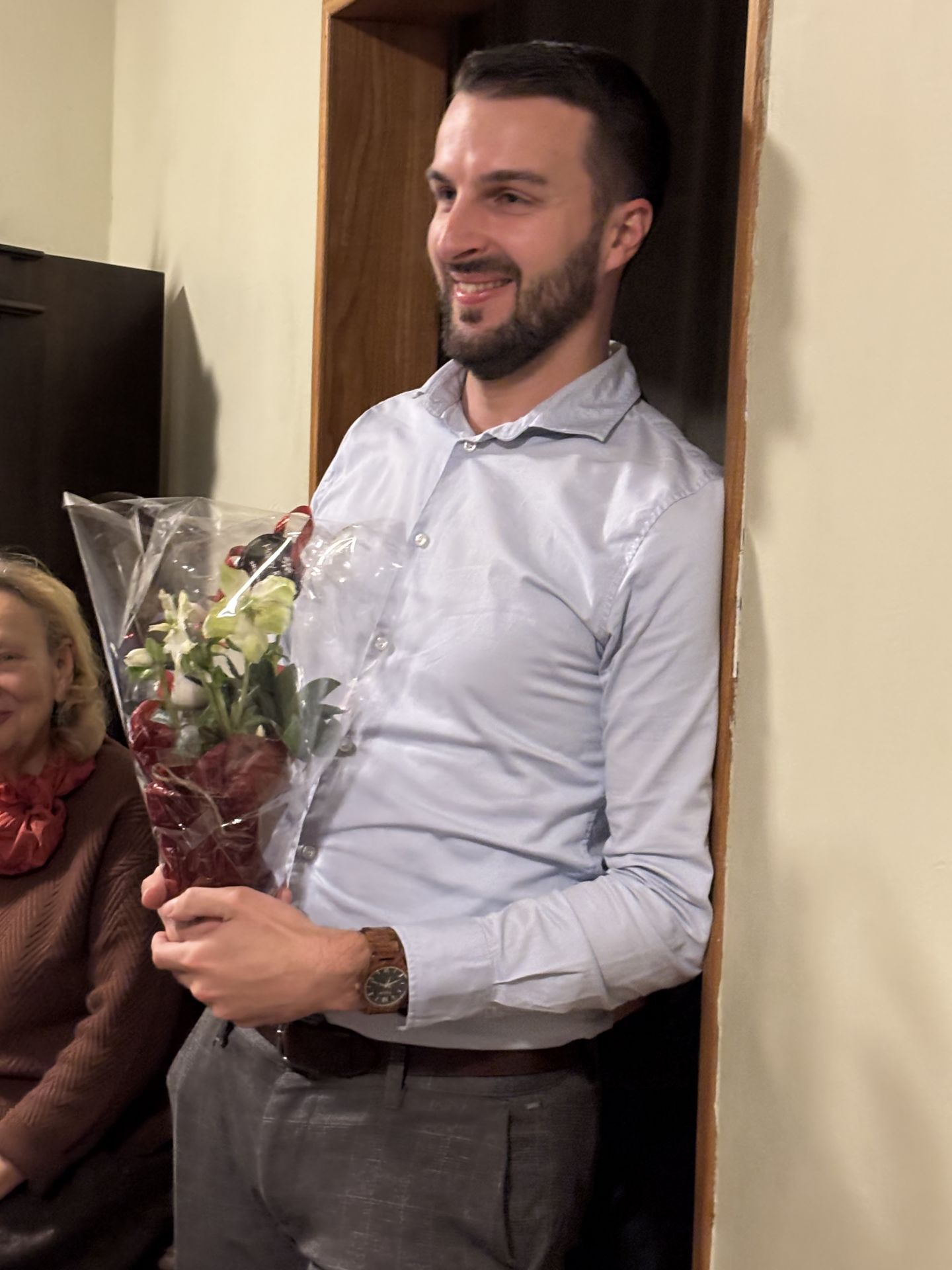 Även ordförande Kim Björklund har haft mycket arbete med bokprojektets tillblivelse och avtackades också med en julblomma. (Foto: Synnöve M)