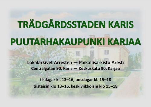 Utställningen Trädgårdsstaden Karis - Puutarhakaupunki Karjaa öppnades 14.5.2019 och hängde i Arrestens korridor ända till sommaren 2020. Temat utgår från att stationssamhället Karis ursprungligen planerades som en s.k. trädgårdsstad. Den inofficiella planen utarbetades omkring 1915 av lantmäteriingenjör Volmar Svaetichin. Utställningen kan liksom tidigare utställningar lånas helt gratis, se här.