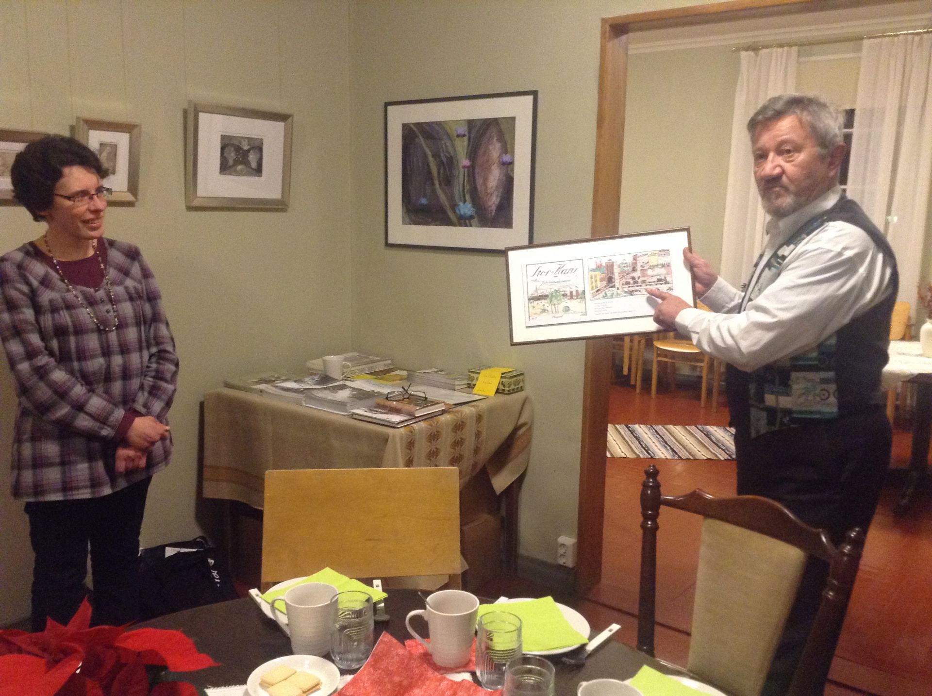 Sonja Harjulle ojennettiin jäähyväislahja, taulu Volmar Svaetichinin piirtämästä visiosta Suur-Karjaasta, sekä Torsten Bergmanin kirjoittama runo.