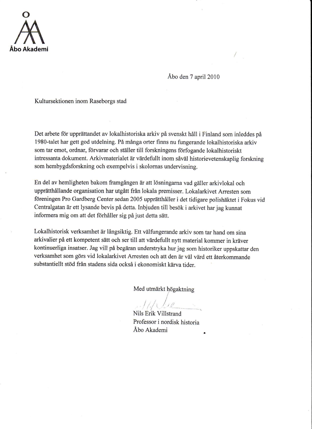 Nils Erik Villstrands brev till Kultursektionen inom Raseborgs stad: