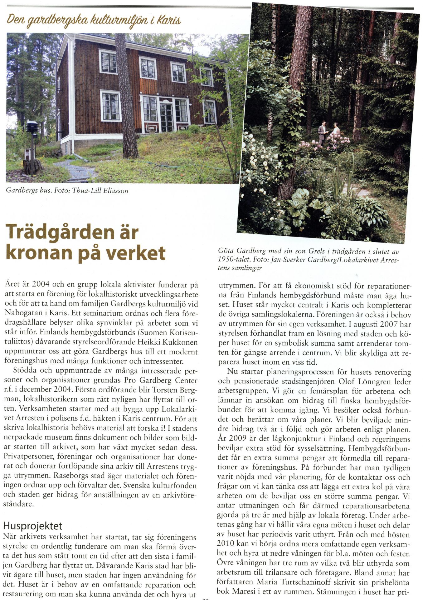 Det blev en fin dag för Gardberg Center i lördags i samband med Karis- Suomen Paris- dagen. Vi fick drygt 70 namn i gästboken. Besökarna berömde huset och den vackra nyanlagda trädgården. Flera karisbor sade sig ha beundrat huset då de gått förbi på sina promenader och undrat hur det månne ser ut bakom fasaden - nu fick de bekanta sig med det. Och beundra Göta Gardbergs målningar och Barbro Gardbergs transparenta vävnader. Vi hade besökare från Storhelsingfors men också längre ifrån så som Storbritannien, Norge och Sverige. Många bläddrade med stort intresse i de framställda lösnumren av vår lokalhistoriska tidskrift Ta Plats och köpte egna exemplar. Uppskattningsvis fick föreningen dessutom fyra nya medlemmar. Flera var de besökare som uttryckte sin uppskattning över initiativtagarna till hela arrangemanget "Karis- Suomen Paris/Karis- Finlands Paris"(Text: Beatrice Blåfield).