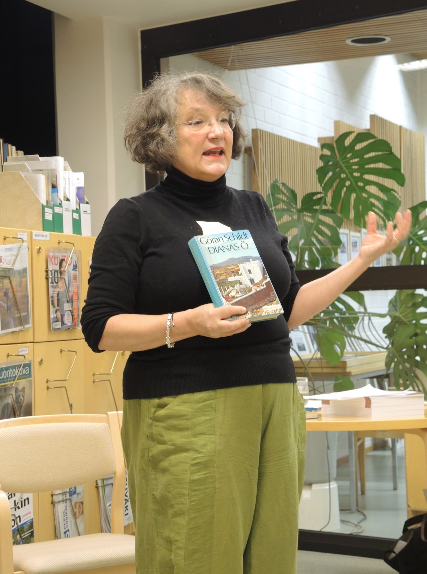 Monika Fagerholm berättade med inlevelse om ön och dess historia där Göran och Christine Schildt har bott så många år. Hon hade mycket att berätta, tyvärr räckte inte tiden till mer om Göran och hans kolleger än några korta inblickar. Hennes berättarkonst hade nog kunnat fängsla publiken en lång stund till. Ett tjugutal personer hade anlänt till Pojo bibliotek denna mörka novemberkväll. Fler hade rymts med, men bra så här.