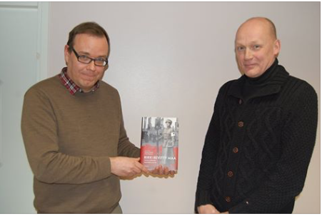 FD Aapo Roselius tillsammans med Gardberg Centers ordförande Christer Kuvaja. Boken som Roselius visar upp är en ny bok som behandlar inbördeskriget där han själv står som författare tillsammans med Tuomas Tepora. (Text: Beatrice Blåfield - Foto: Kai Jauhiainen/Länsi-Uusimaa)