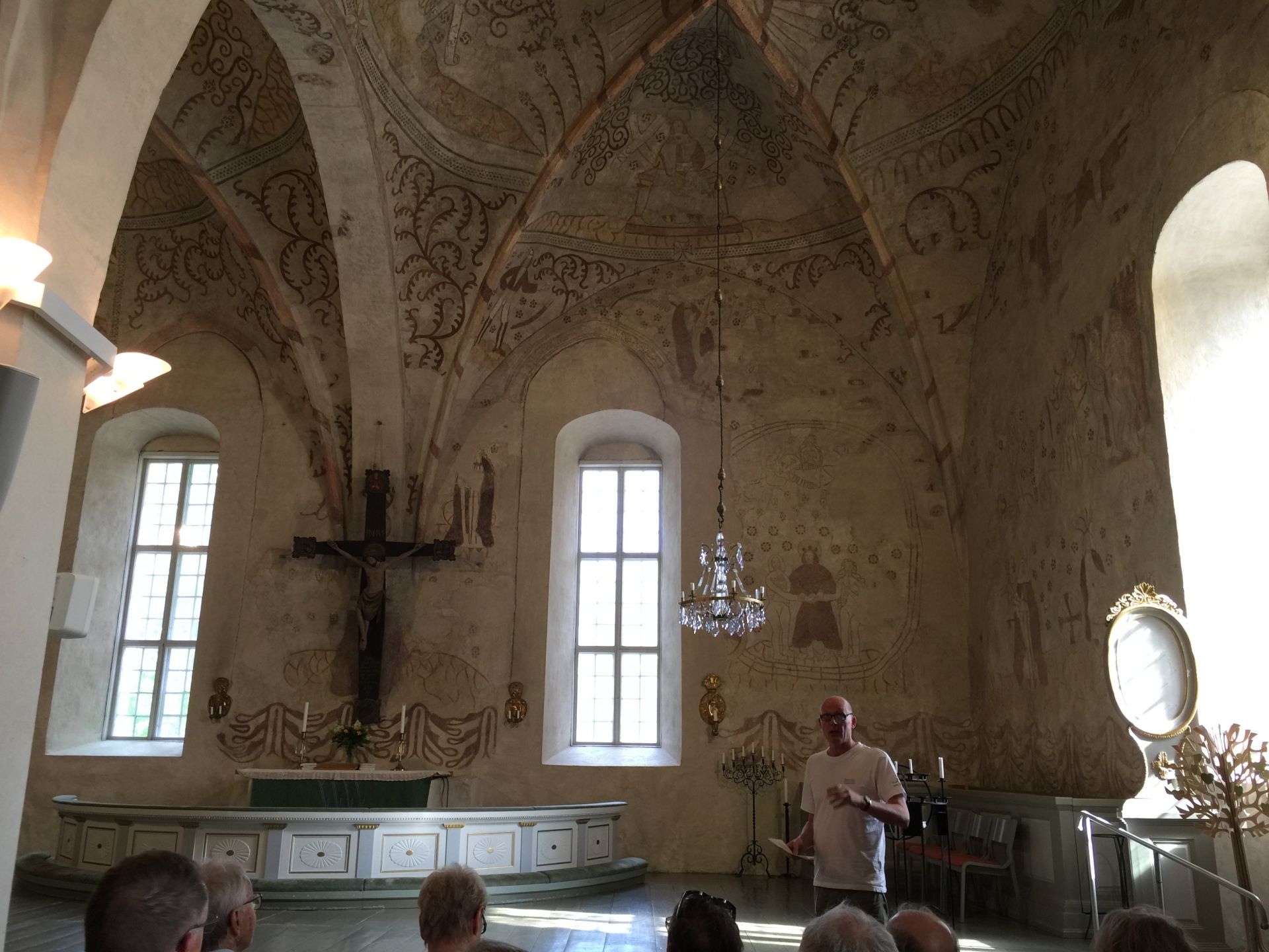Christer Kuvaja berättar om vägg- ochtakmålningarna i Ingå kyrka.