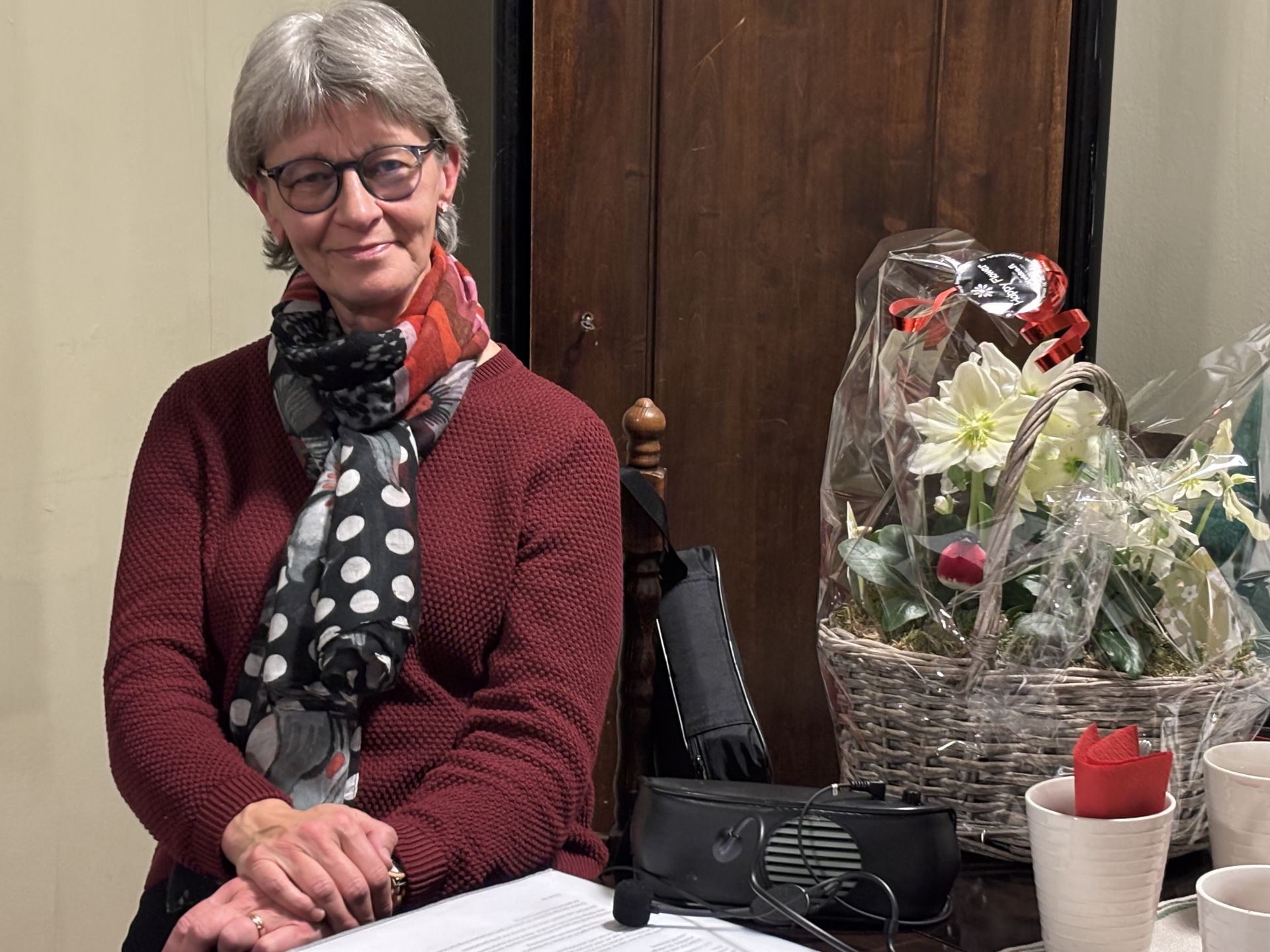 Även ordförande Kim Björklund har haft mycket arbete med bokprojektets tillblivelse och avtackades också med en julblomma. (Foto: Synnöve M)