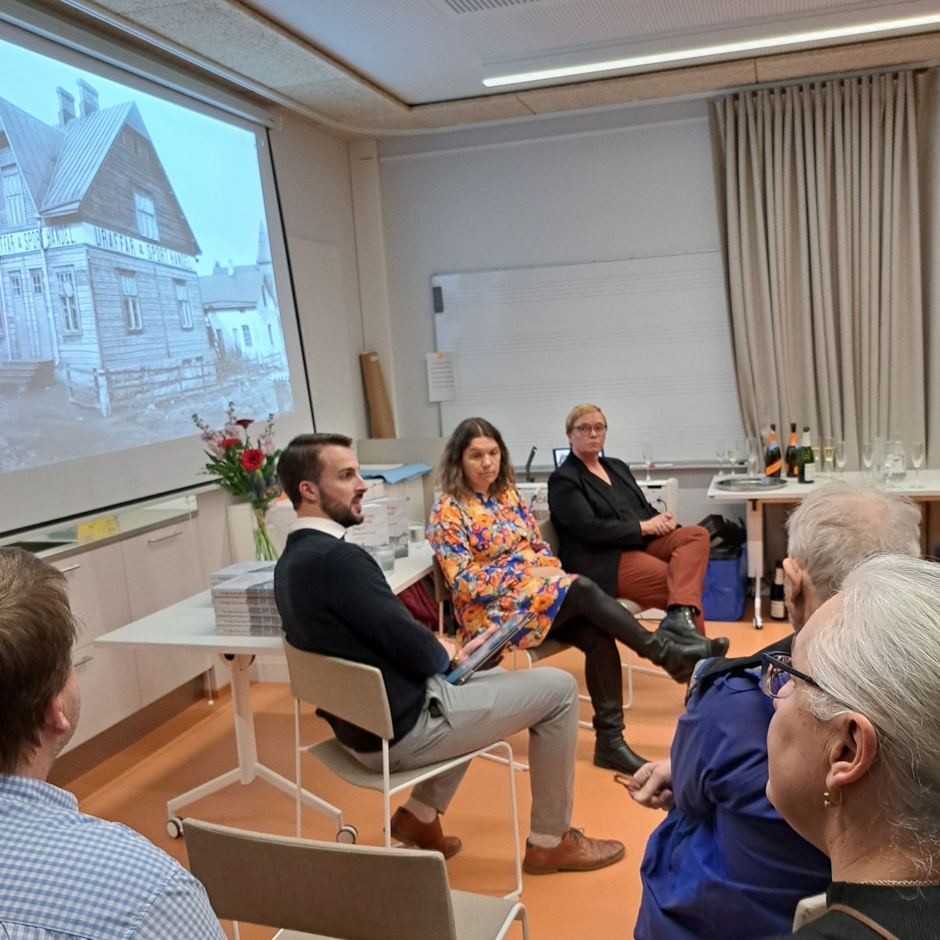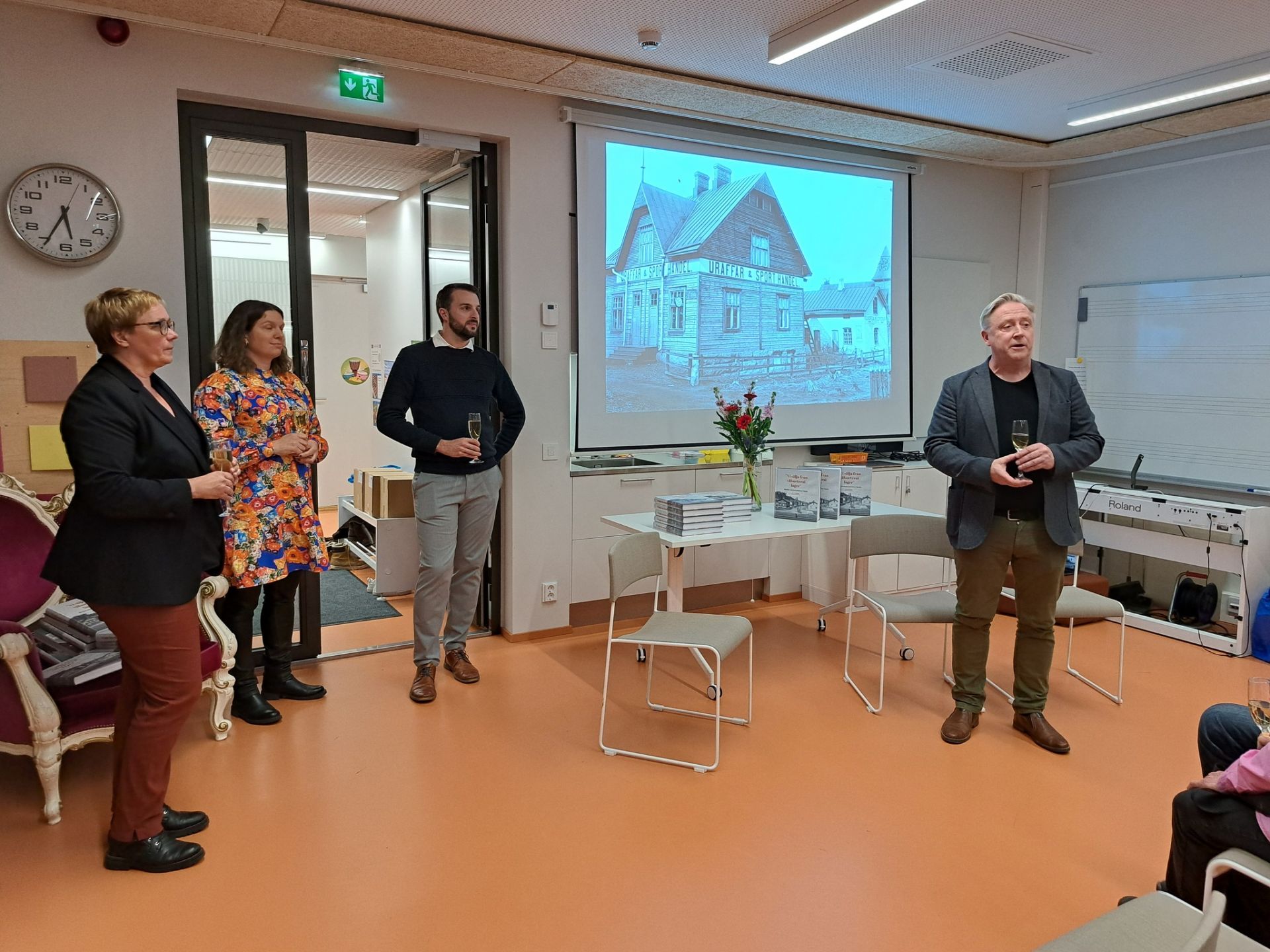Författarna Johanna Wassholm, Anna Sundelin och redaktören Christoffer Holm hyllas av Gardberg Centers ordföande Kim Björklund. Foto: Thua-Lill Eliasson.