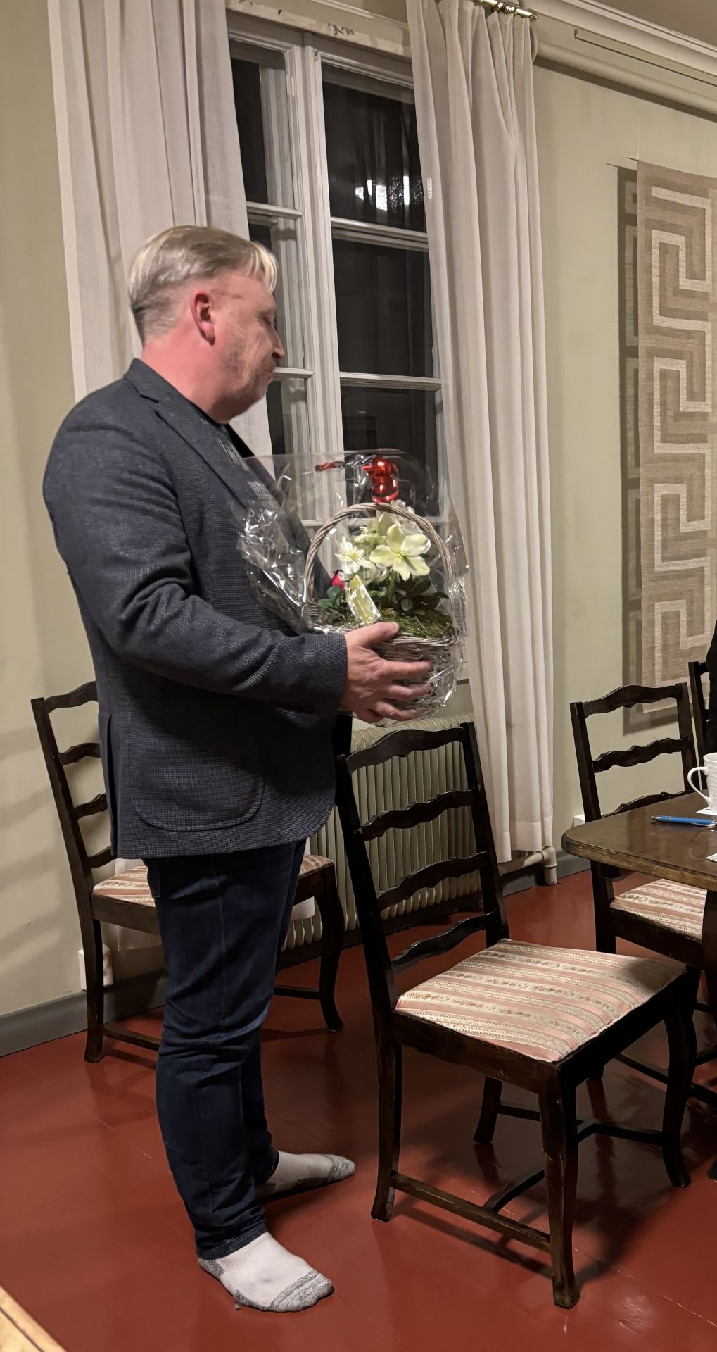 Även ordförande Kim Björklund har haft mycket arbete med bokprojektets tillblivelse och avtackades också med en julblomma. (Foto: Synnöve M)