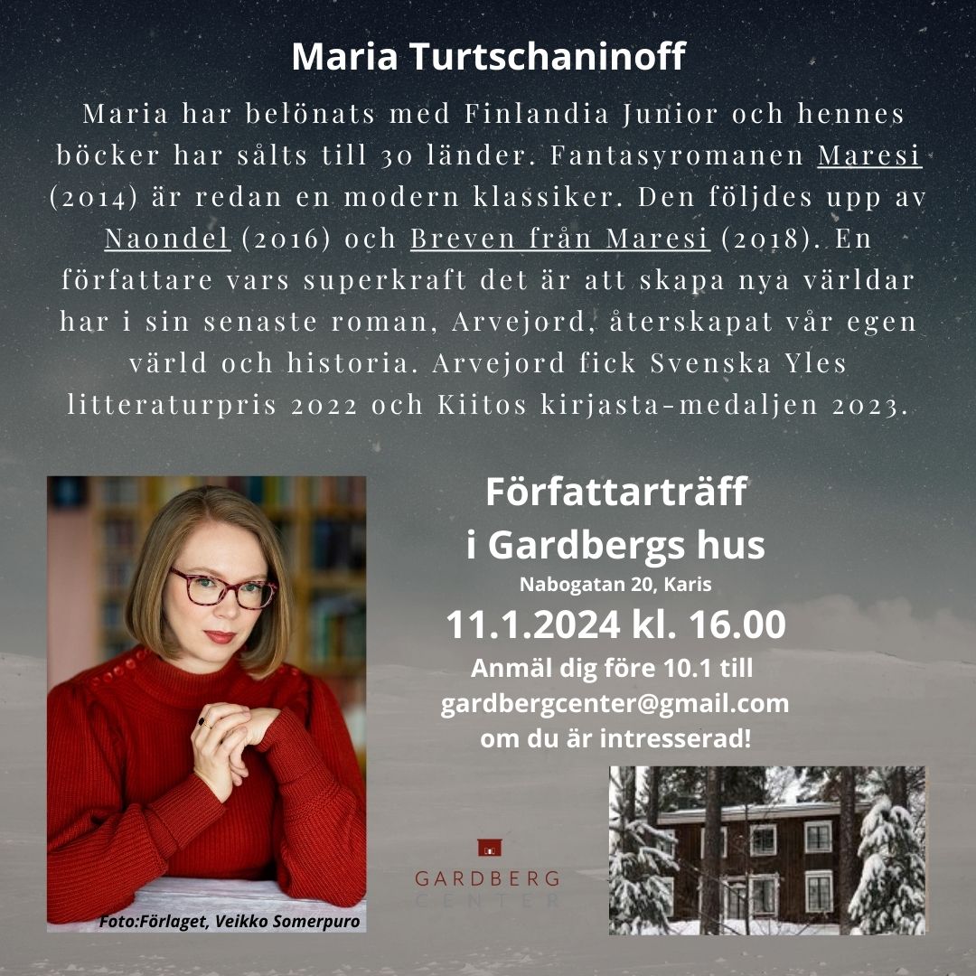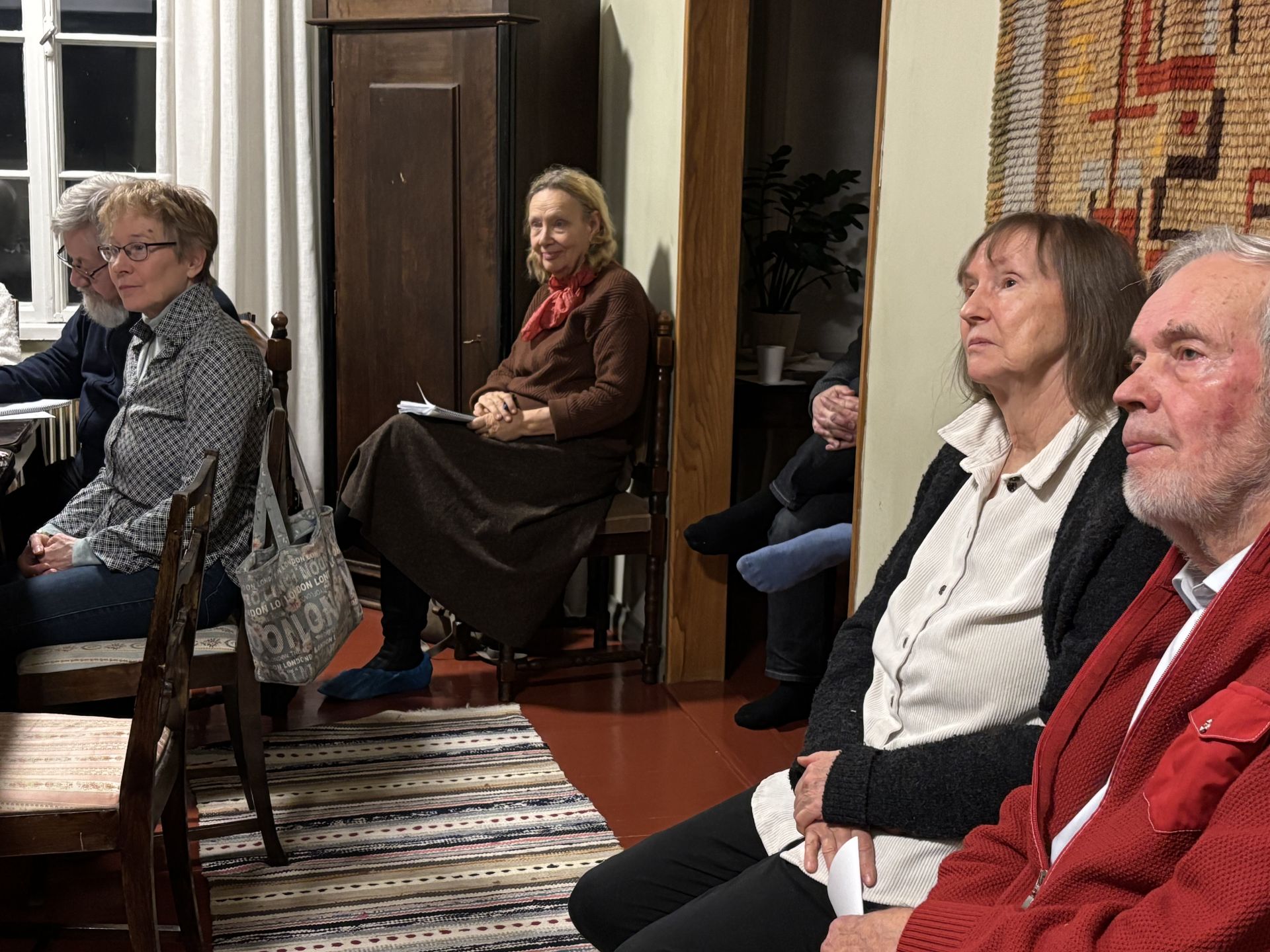Det blev en trevlig träff med Maria Turtschaninoff då ett tjugutal åhörare lyssnade och diskuterade Marias senaste bok Arvejord.